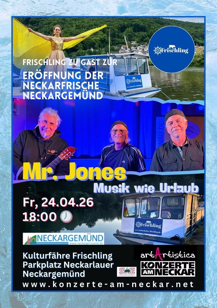 Am Freitag, dem 24. April 26 starten die Konzerte am Neckar mit einer fröhlichen Party in die neue Saison der Kulturfähre Frischling: Gemeinsam mit der Stadt Neckargemünd wird der Neckargemünder Neckarlauer wieder in ein sommerliches Festivalgelände verwandelt. Musik wie Urlaub heißt das Motto des sensationellen Trios Mr. Jones. 18:00 wird die Neckargemünder Neckarfrische am Lauer eröffnet und ab 18:30 beginnt die Livemusik. Es darf gelauscht und getanzt werden.