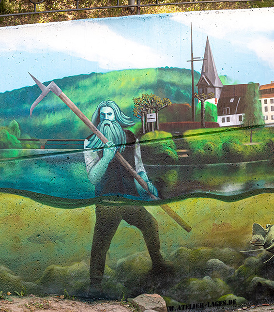 Die alte Sage vom Hookemann (Hooke – kurpfälzisch für Haken) ist heute kaum noch bekannt – allenfalls ein paar Neckartal-Dörfler erinnern sich daran. Genau deshalb möchten wir diesen geheimnisvollen Wassergeist wieder sichtbar machen – mit dem modernen Grafitti und der alten Geschichte, die tief mit dem Flößerleben am Neckar verwoben ist.